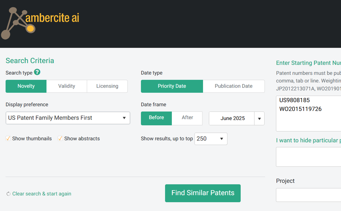 2) Copy these into the Ambercite search engine - and optionally copy the other patents you have found into the hide box
