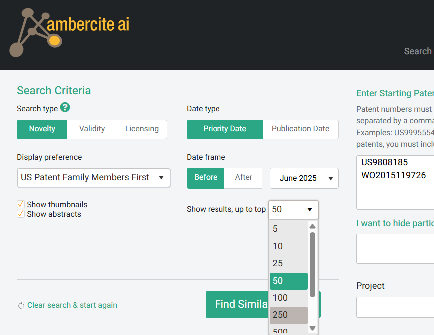 So we might expand the patent search from the default most similar 50 up to the most similar 250 patents instead:
