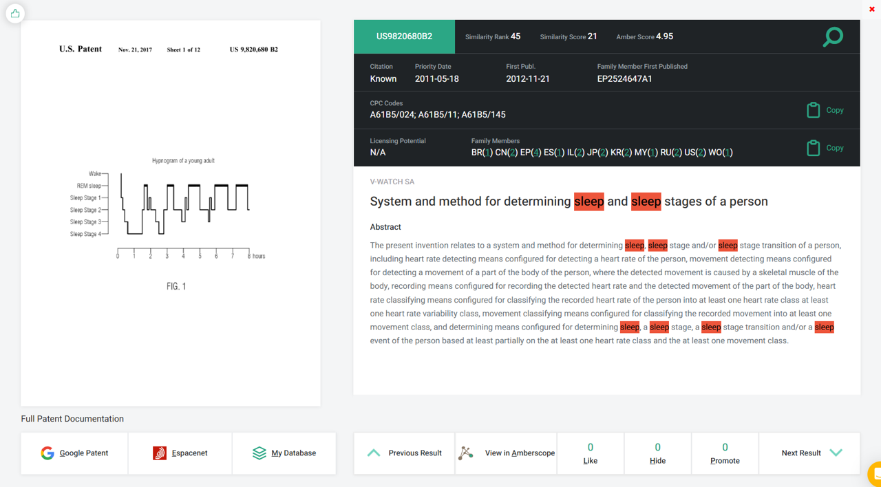 Often in Ambercite searching such a simple query is sufficient, but a quick review of the results suggests that the results are a combination of patents for monitoring sleep, and patents for monitoring other activities, as shown below. Perhaps a slightly more focused search can be justified.