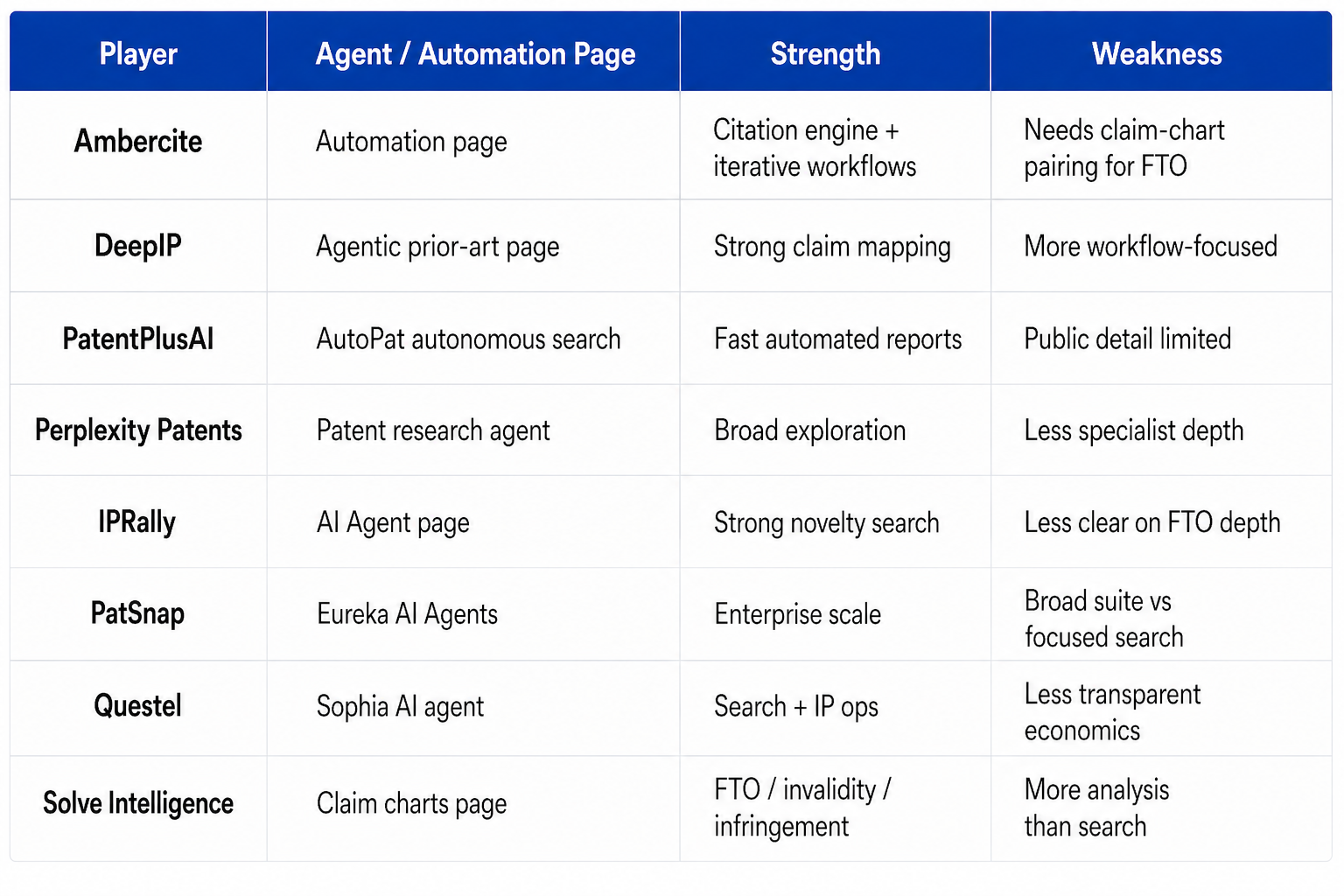 The table compares 8 leading AI patent search players based on their public agent or automation positioning, highlighting each platform’s strongest advantage and its main current limitation.