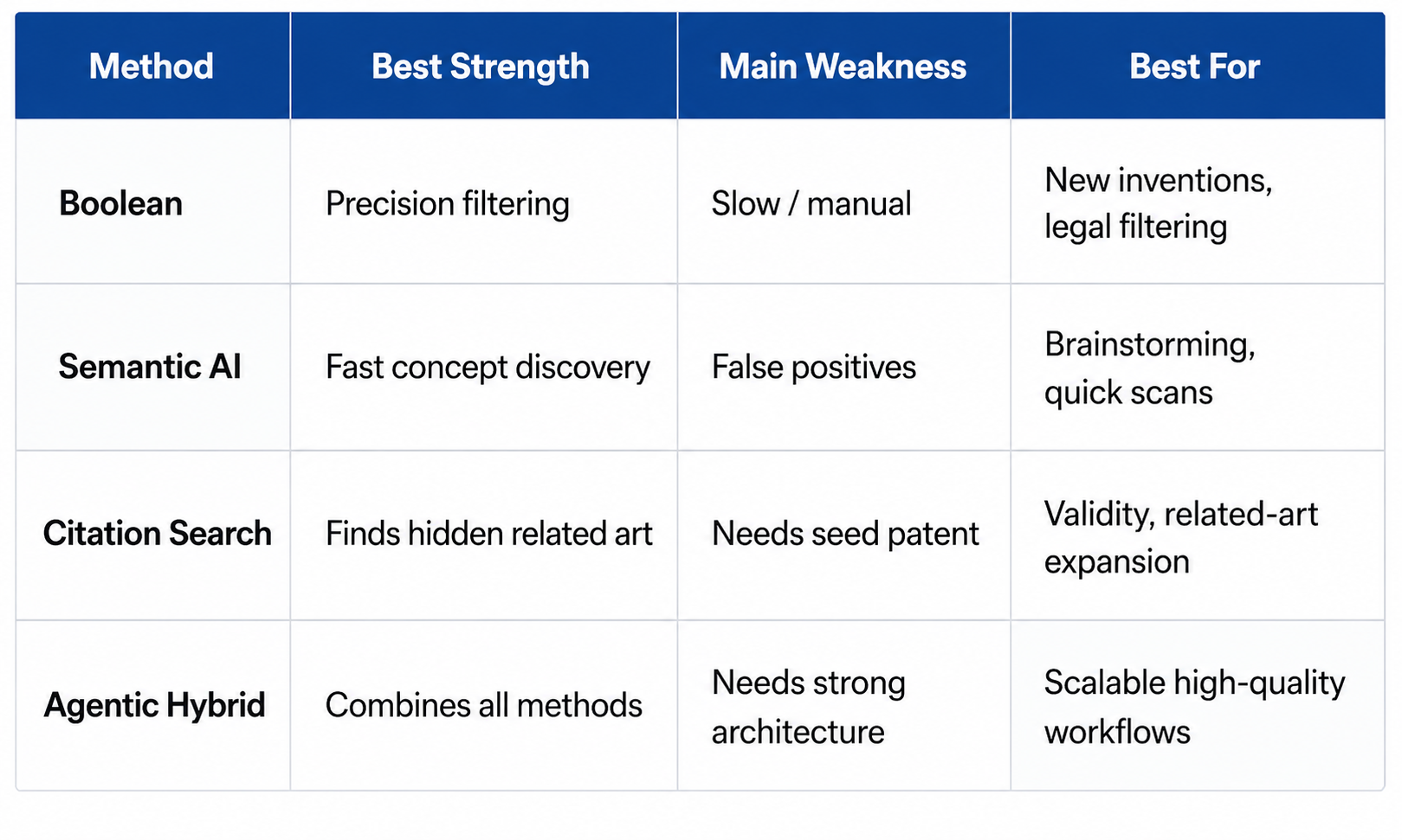 The table below summarizes the four main patent search methods, comparing their strongest advantages, key limitations, and the situations where each performs best.