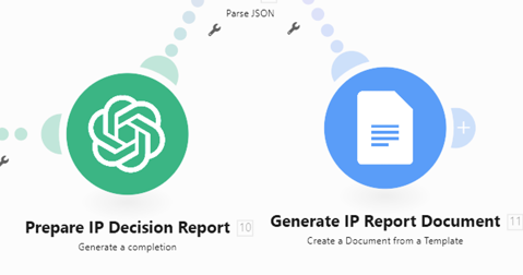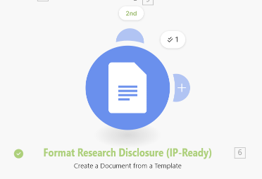 The workflow starts by generating the IP research disclosure document. It creates a Google Doc that serves as a base, which can then be manually edited by the IP team and the researcher if necessary, before being sent to the IP lawyer for drafting later in the process, after committee validation.