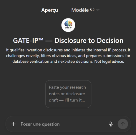 Custom GPT in ChatGPT. The prompt is customized to challenge the researcher and structure the research disclosure, making it ready for an IP lawyer to draft the patent and for the workflow to generate the Patent Search Report (PSR).